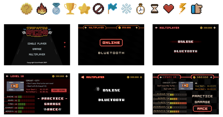 Once we were all happy with the direction, style and feel the project was taking, we started the production phase. This is a critical, creative and also mechanical state, where we quickly need to create many elements, all consistent and coherent with each other, for all the game's menus and sub-menus. Constant iteration and approval from the whole team is needed, in a point where quality needs to meet quantity.